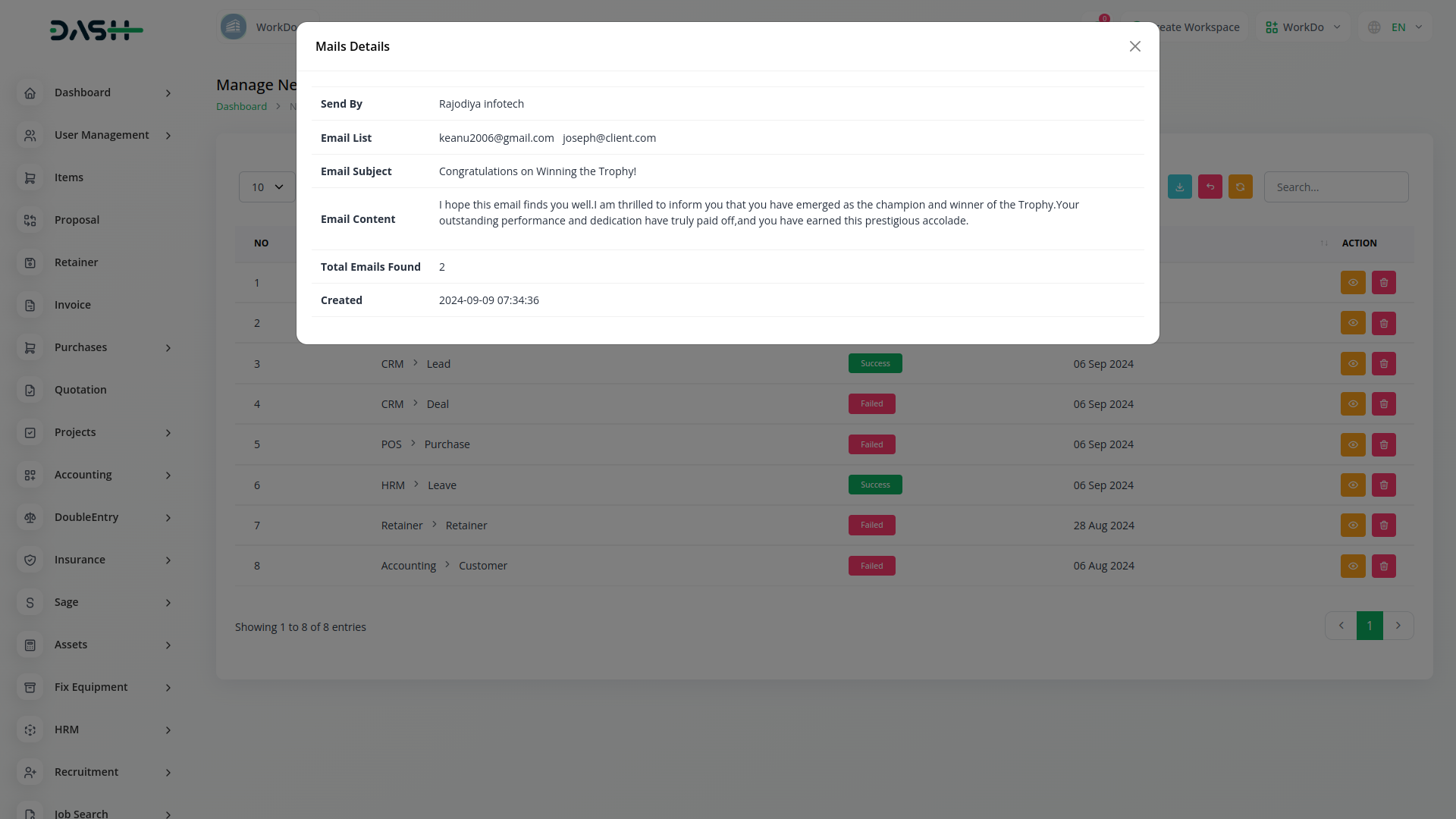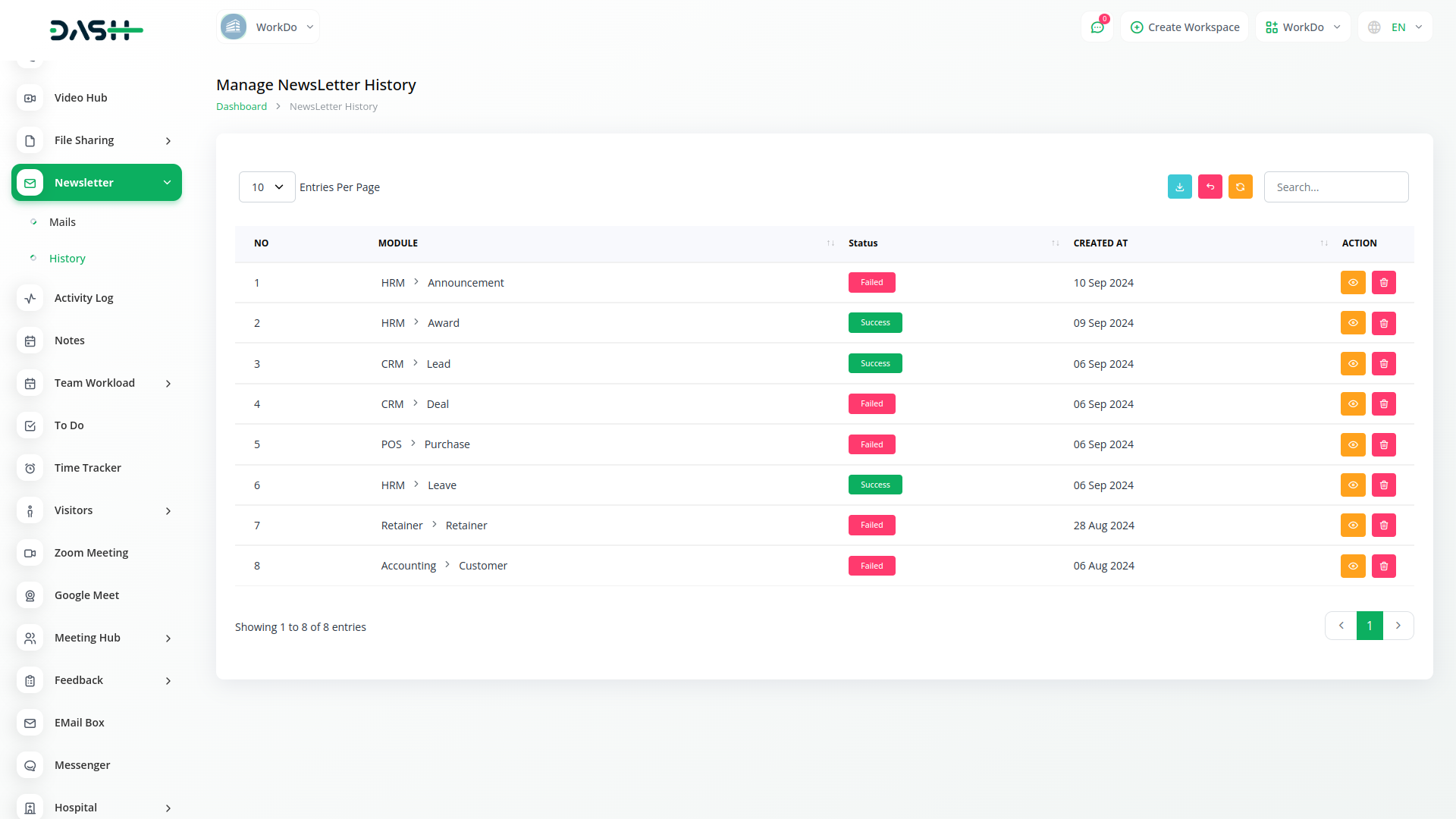 Newsletters provide a history of email statuses, allowing you to see if emails were successfully sent or if there were any issues.Using the history of the newsletter, you can also see how many people have sent the mails and to which time.