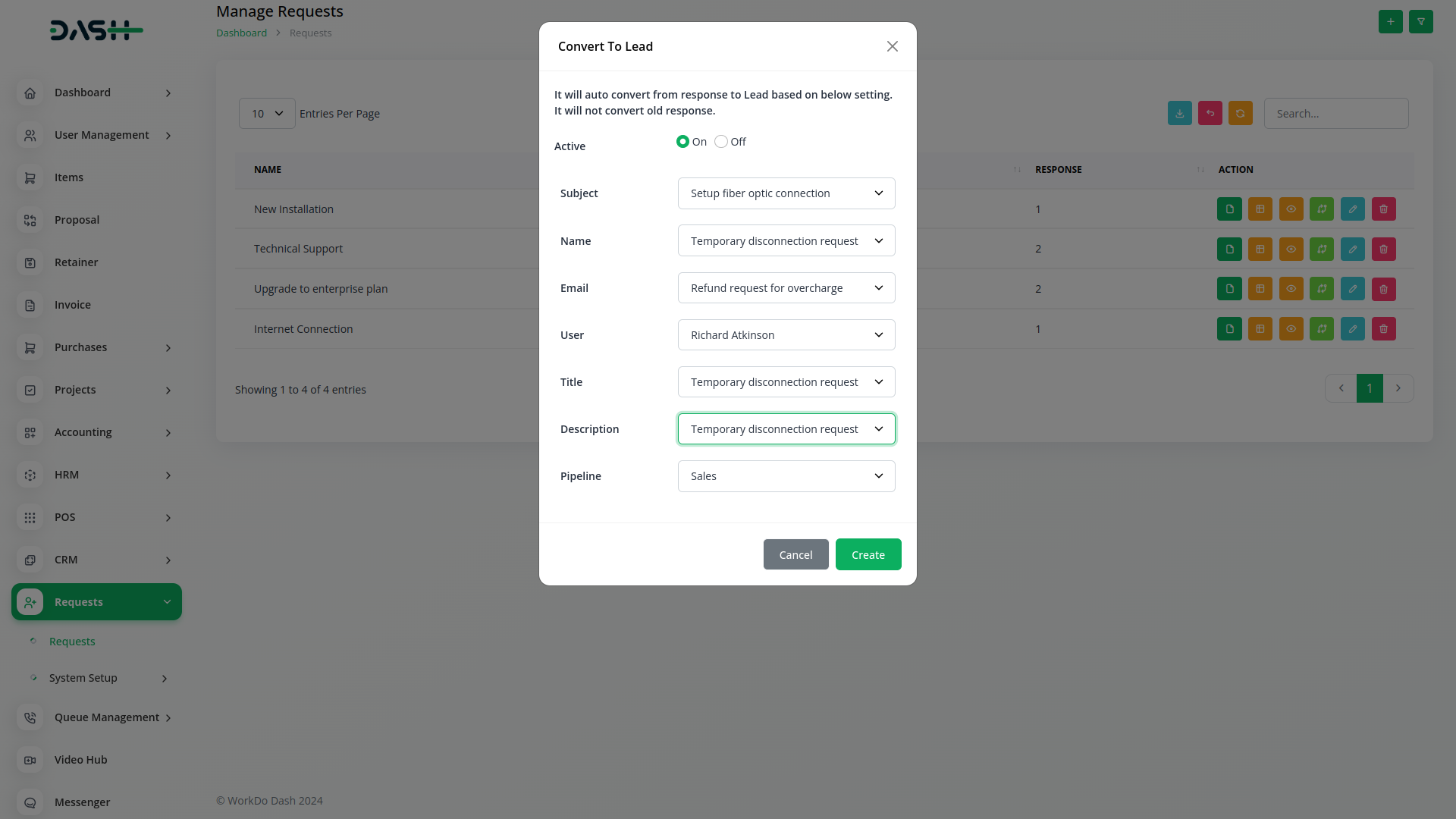In the "Actions" section of the platform, you'll find numerous features designed to enhance your workflow. You can quickly copy the request link, edit or view form fields, review responses, and convert requests into leads or CRM entries with ease. When you transform a request into a lead, all details are seamlessly moved to the lead column. Alternatively, converting it into a CRM entry allows for straightforward form completion directly from the front end. Additionally, you have the option to rename the form to suit your preferences, providing added flexibility.