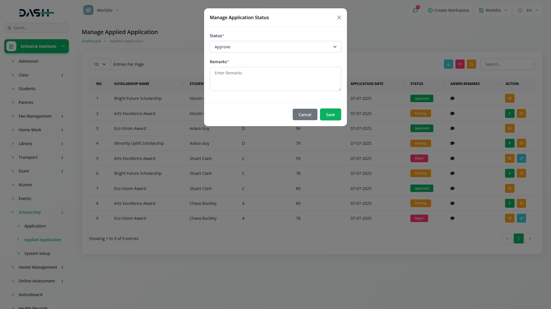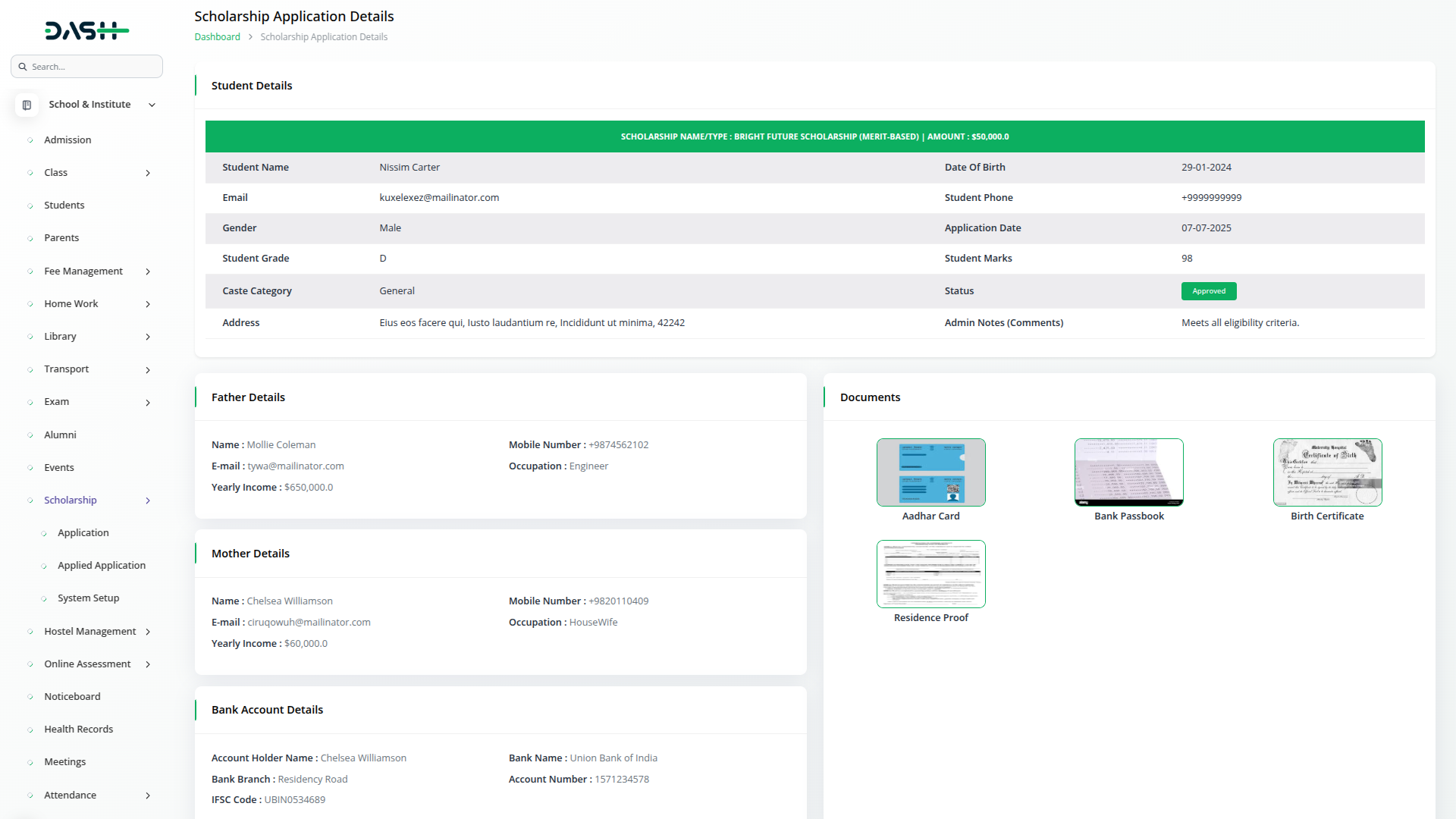 O sistema captura informações essenciais do aluno, incluindo desempenho acadêmico, detalhes pessoais e antecedentes familiares. A funcionalidade de upload de documentos garante que todos os materiais necessários sejam devidamente enviados e rastreados. Os alunos também precisam inserir os detalhes de sua conta bancária para o desembolso direto de fundos. Atualizações de status de aplicativos em tempo real mantêm os candidatos informados durante todo o processo de revisão.