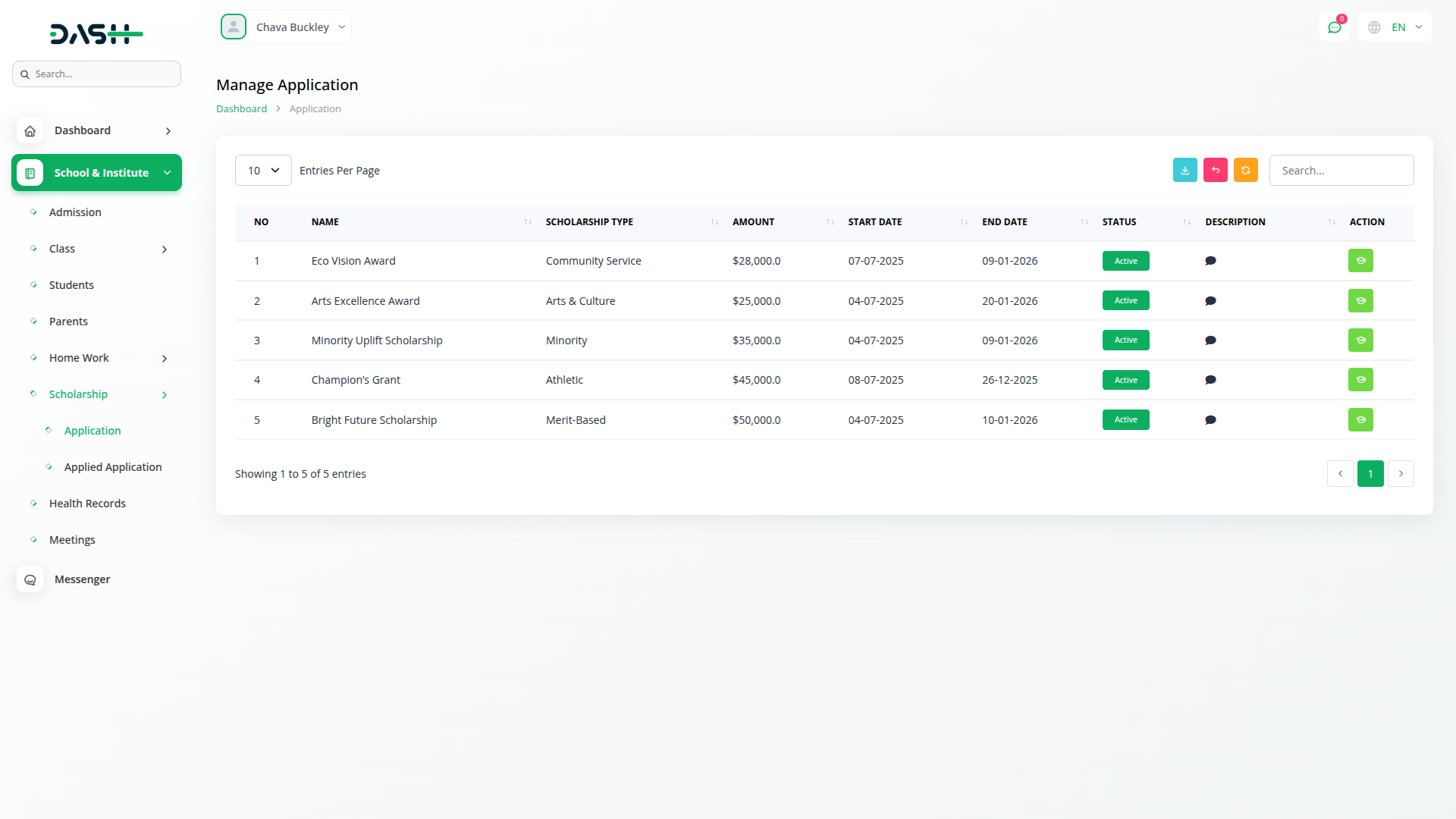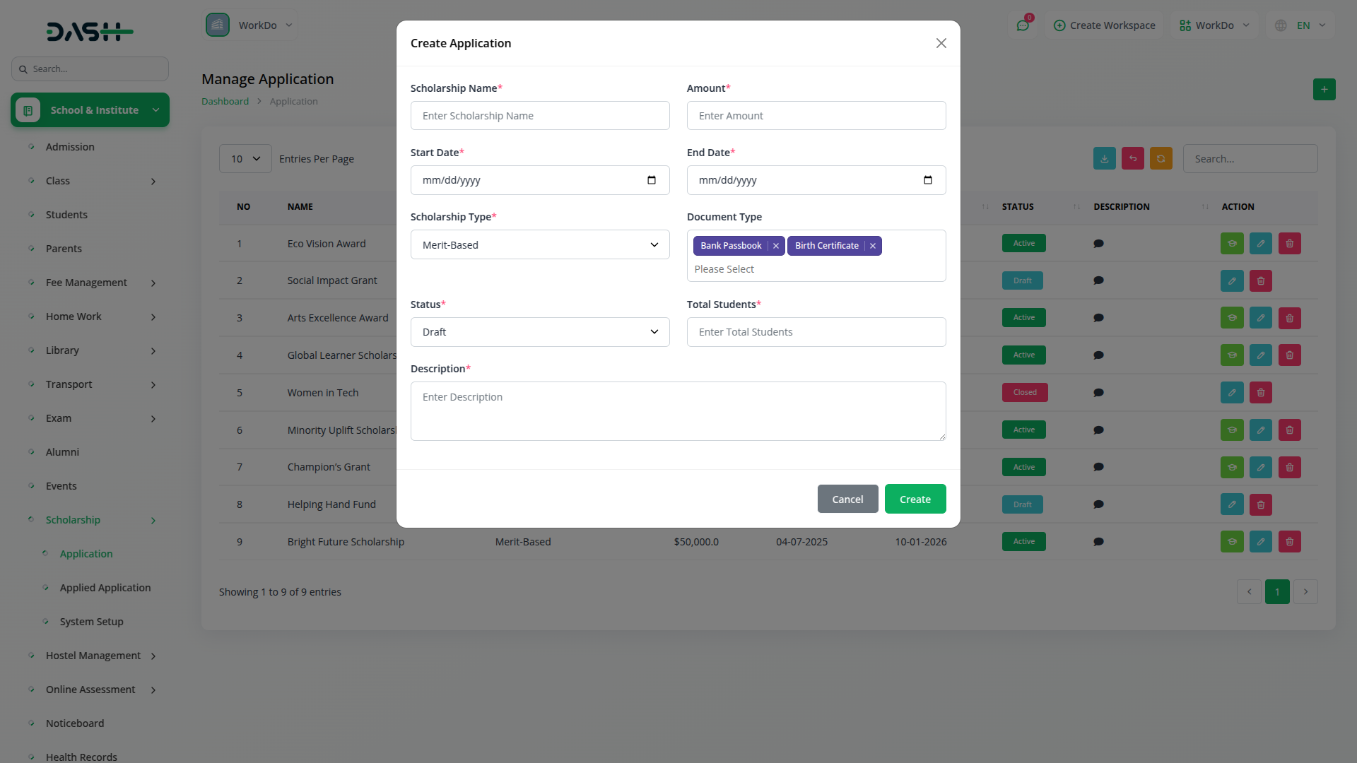 Os administradores podem criar programas de bolsas de estudo abrangentes definindo nomes, descrições e montantes de financiamento específicos e definindo datas de início e término de inscrição. Cada programa pode ser atribuído a categorias ou tipos específicos, com limites de alunos configuráveis para gerenciar a capacidade. Uma configuração de status ajuda a rastrear se uma bolsa de estudos está atualmente aberta ou fechada para inscrições.