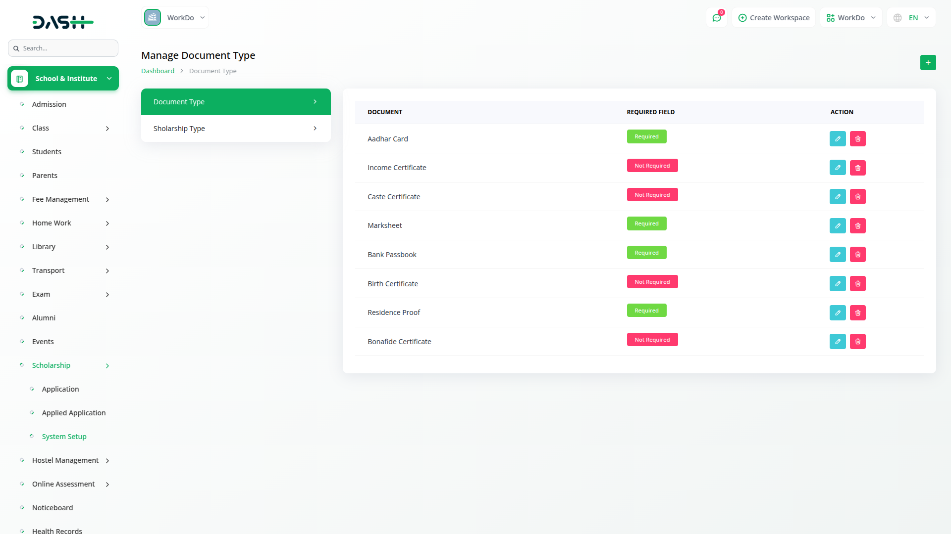 A fundação da gestão de bolsas de estudo começa com uma configuração abrangente do sistema. Os administradores podem definir tipos de documentos com requisitos personalizáveis, garantindo padrões de documentação adequados em todos os aplicativos. O sistema permite a categorização flexível de bolsas de estudo através de tipos de bolsas de estudo configuráveis, permitindo que as instituições organizem seus programas de forma eficaz. Cada tipo de documento pode ser marcado como necessário ou opcional, fornecendo controle granular sobre os requisitos do aplicativo. O módulo de configuração garante a consistência na coleta de dados e mantém processos padronizados em diferentes programas de bolsas de estudo.